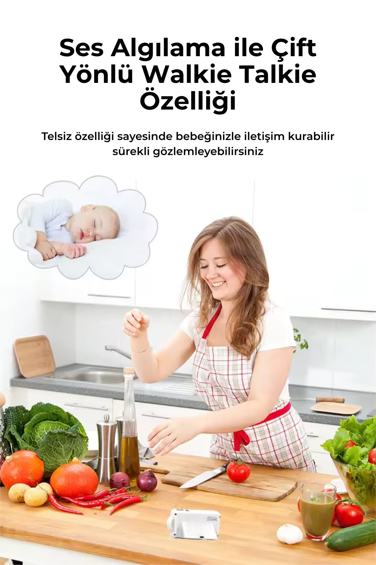 2.4GHz FHSS kablosuz bağlantı ile çalışan sistem WiFi gerektirmez, bu da güvenli ve stabil bağlantı avantajı sağlar. Gece görüş, iki yönlü ses iletişimi, ağlama algılama ve beslenme alarmı gibi özellikler yalnızca izleme değil aktif ebeveyn desteği sunar.